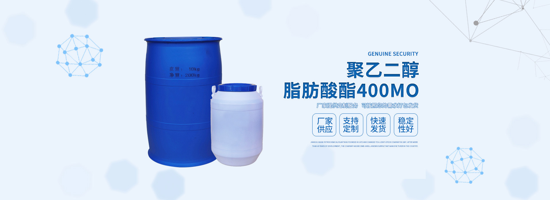 南通德信化工有限公司是一个集科、工、贸为一体的现代化企业。公司多年来一直致力于表面活性剂在食品、纺织、印染、化纤、染料、造纸、皮革、金属加工、电子等领域的开发和应用。产品现已形成7大类,30多个系列,300多个品种。 本公司积极开拓进取,在研究开发新产品的同时,始终坚持“质量第一、服务客户”的原则。公司产品在众多厂家客户心目中创立了良好的信誉,并建立了良好的经营合作关系。